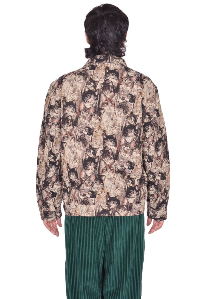 Unisex trucker jacket in cats pattern gobelin weaving features a wide collar, a button front closure and long sleeves with buttoned cuffs from BLESS N°80 "Reflexic" collection.