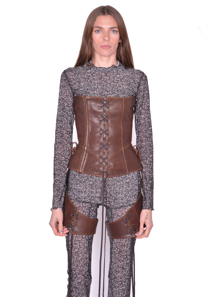 Real lamb leather corset in brown featuring detachable chaps, a lace up front and chaps , and off-center zip front closure from Knwls 2025SS collection.
