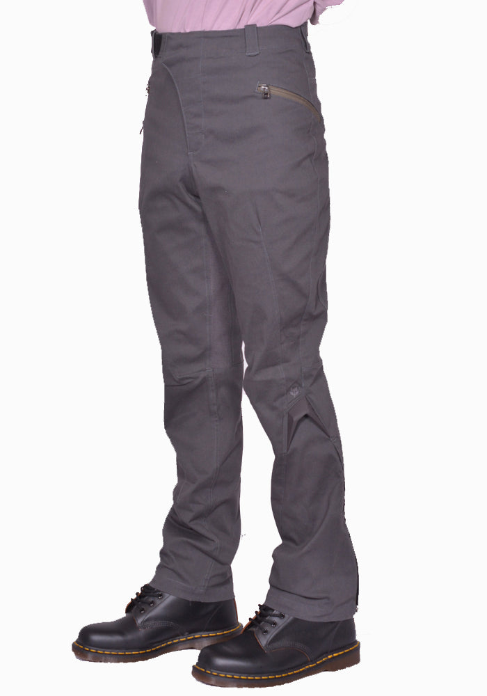 Unisex, The Moto-pants in dark shadow grey stretch cotton featuring a zip front with an asymmetric fly opening, darting through knees and adjustable zip closures at ankles from KIKO KOSTADINOV x FOX LAB 2025SS capsule collection.