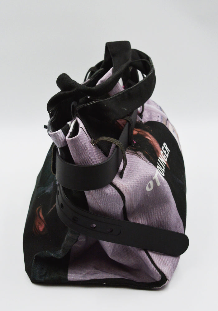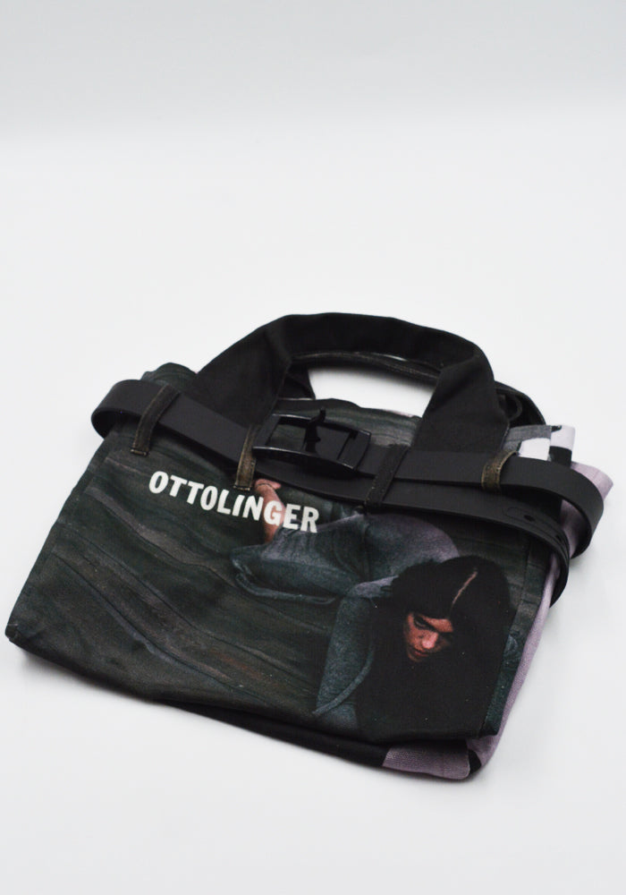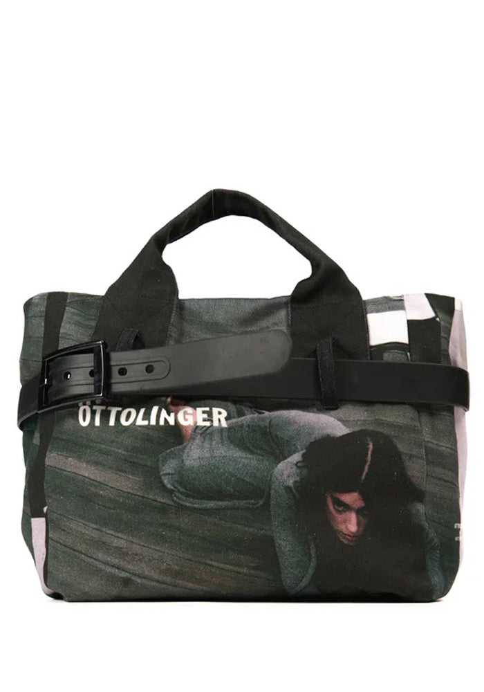 Tote bag in cotton canvas with graphics printed throughout features an open top, double top handles and wraparound black pin buckle belt from Ottolinger 2025FW collection.