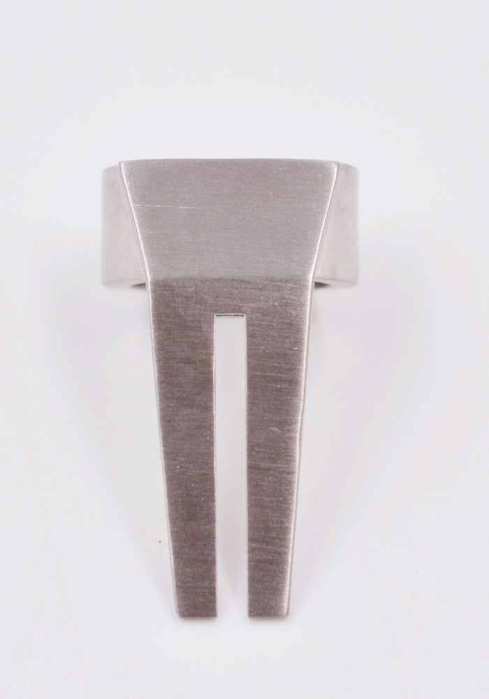 Open trunk ring in silver tone brass featuring thick band, geometric trunk shape with an open face central slit and beveled edges and brand logo engraved on the back from Rick Owens 2026SS "LIDO" Collection.