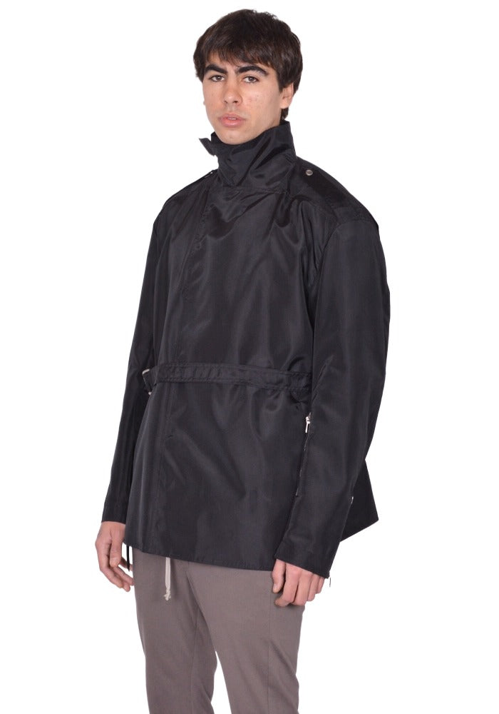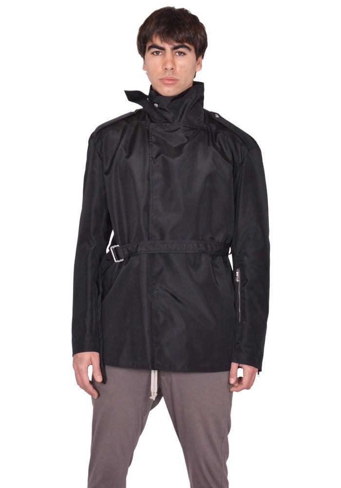 Mens nylon  jacket in black features an off-center snap button front with a high collar with strap closure, and backled waist belt from Rick Owens 2026ss "Temple" Collection.