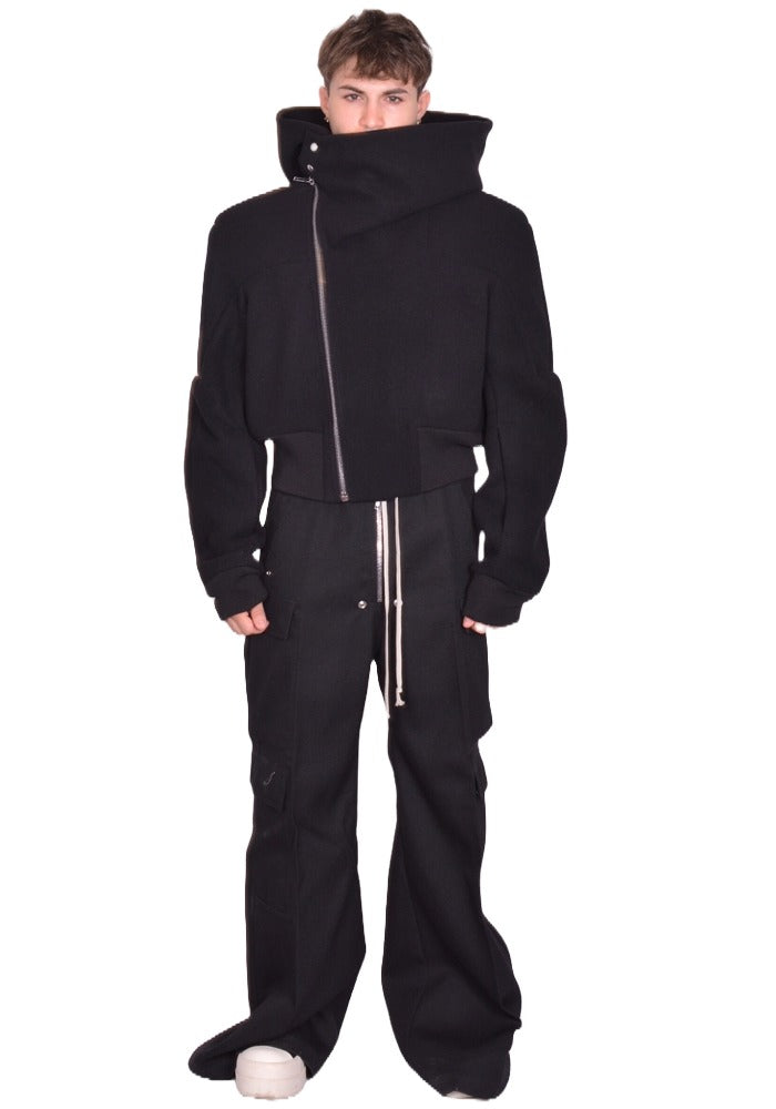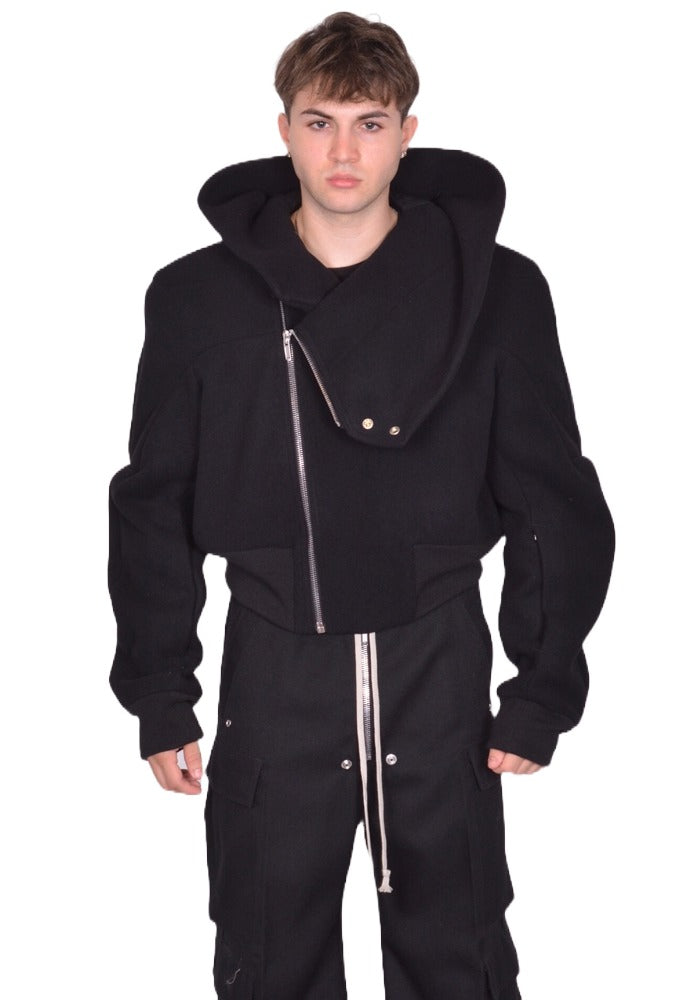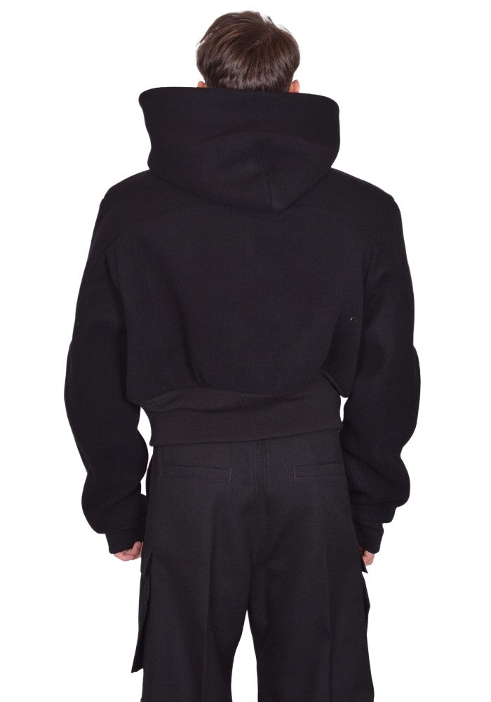 Men's cropped hooded flight jacket in black new wool features an asymmetric zip front closure, a big hood with snap buttones closure, dropped shoulders and long sleeves from Rick Owens 2025FW "concordians" Collection.