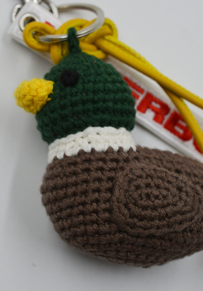 Keyring with a crochet duck figure, a brand logo label, a snap hook and a faux leather tussel from Charles Jeffrey LOVERBOY 2025SS collection.