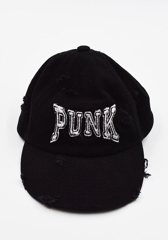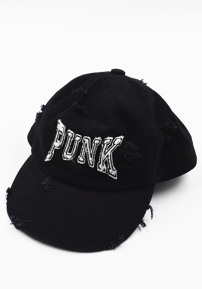 Unisex, Punk cap in black cotton features a panelled construction, "punk" embroidery at front, curved brim and an adjustable back strap from MATIERES FECALES collection.