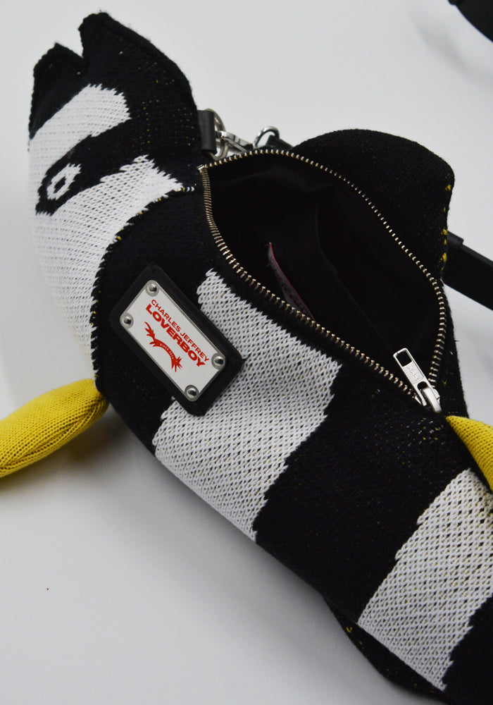 Fish shaped crossbody bag features top zip closure, detachable shoulder strap and cotton lining with internal pocket from Charles Jeffrey LOVERBOY 2025SS collection.
