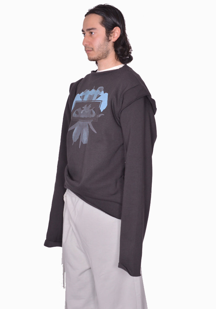 Unisex, asymmetric draped sweatshirt in black organic cotton fleece featuring a crewneck, long sleeves, graphic print at front from Ottolinger 2025SScollection.