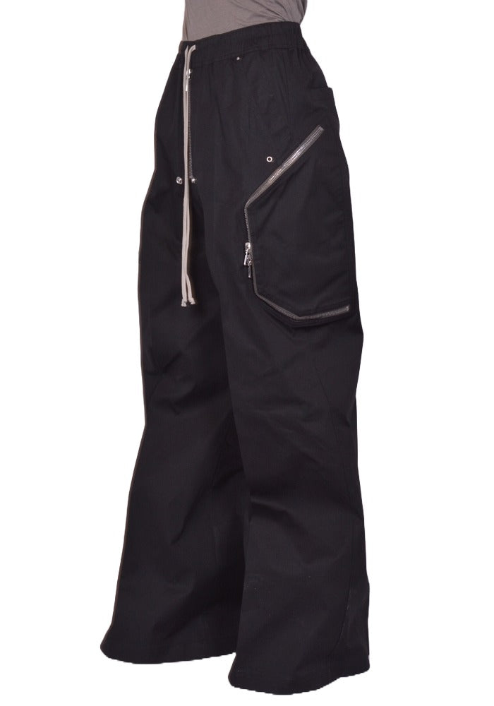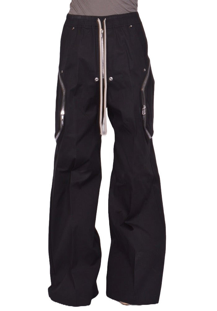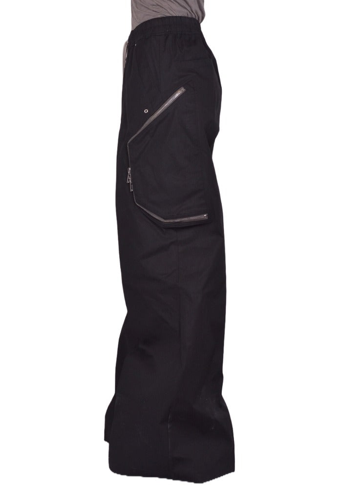 Men's wide legs & elongated pants in black cotton twill featuring an elastic waist band with a drawstring closure, center zipper with rivets and two ways zipped pockets on the thigh from Rick Owens 2026SS "Temple" Collection.