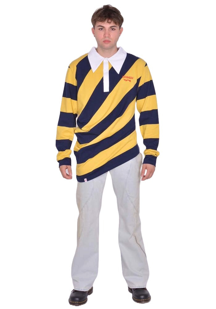 Unisex, Oversized asymmetric polo shirt in yellow/navy stripes pattern featuring a oversized collar in white, long sleeves and brand logo embroidery at chest from Charles Jeffrey LOVERBOY 2025FW collection.