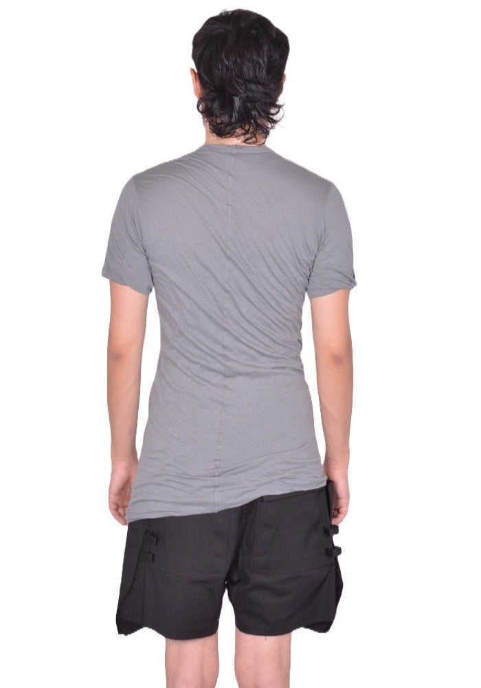 Men's double layered T-shirt in washed indigo color organic cotton jersey featuring a ribbed round neck, short sleeves, below the hip length, back stitching and slight draping detail from Rick Owens 2025FW "concordians" Collection.