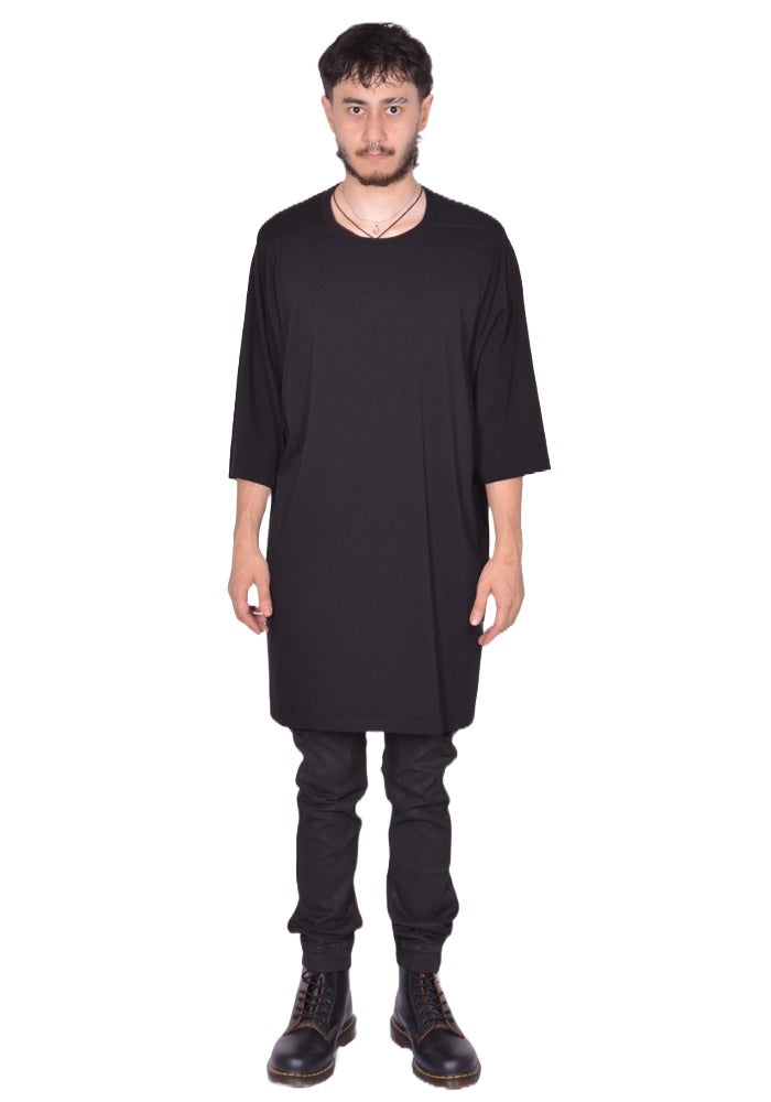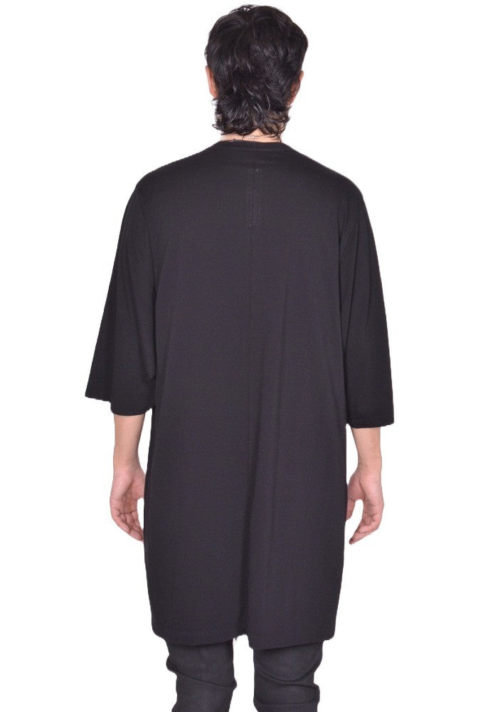 Men's oversize T-shirt in black organic cotton jersey featuring a crew neck, below hip length, short sleeves, horizontal sholder seams and a central back seam from Rick Owens 2025FW "concordians" Collection.