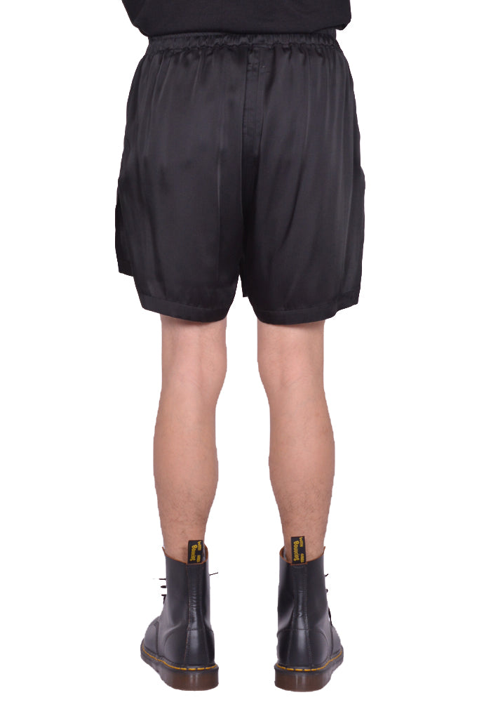 Men's boxers shorts in black acetate/viscose blend features an elastic waistband with a drawstring closure, mid-thigh length and side slits from Rick Owens 2025SS "Hollywood" Collection.