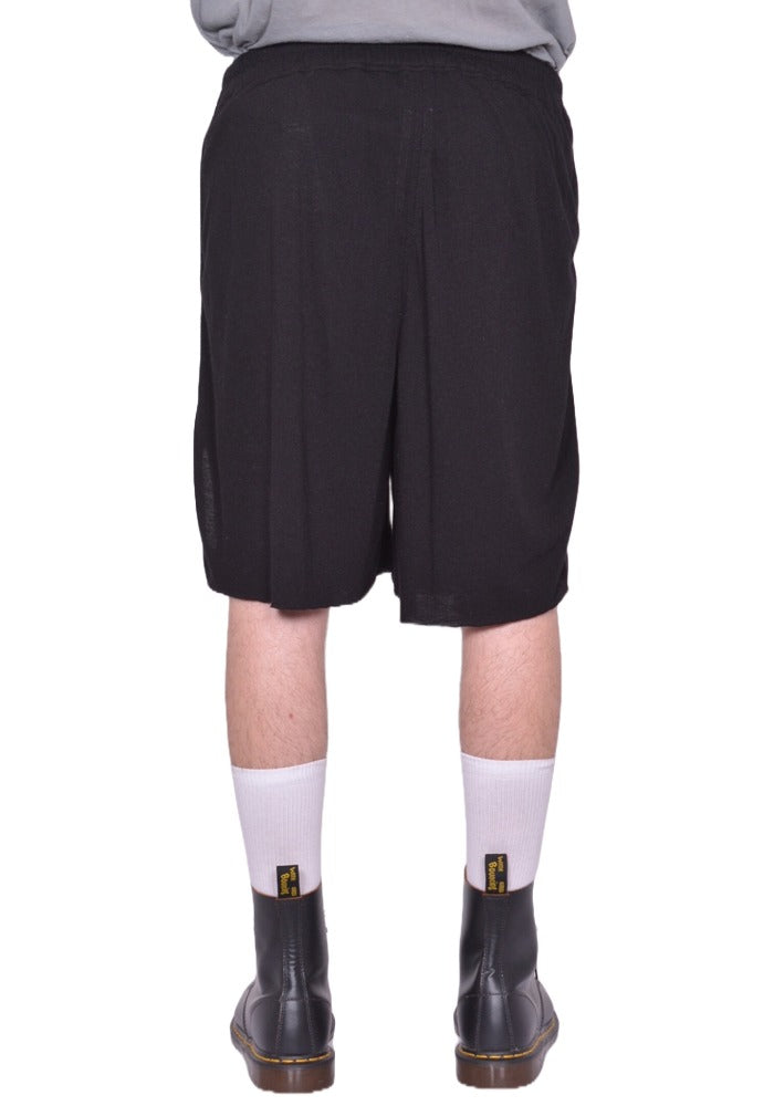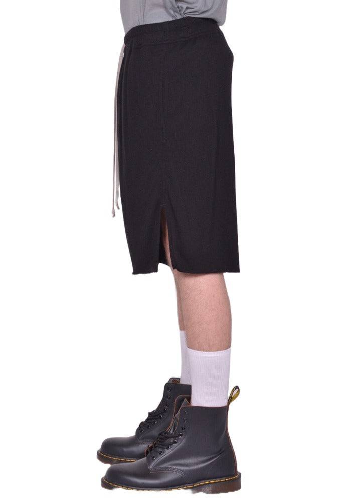 Men's boxers shorts in black nylon/viscose/angola/wool blend features an elastic waistband with a drawstring closure, above knee length length and side slits from Rick Owens 2025FW "concordians" Collection.