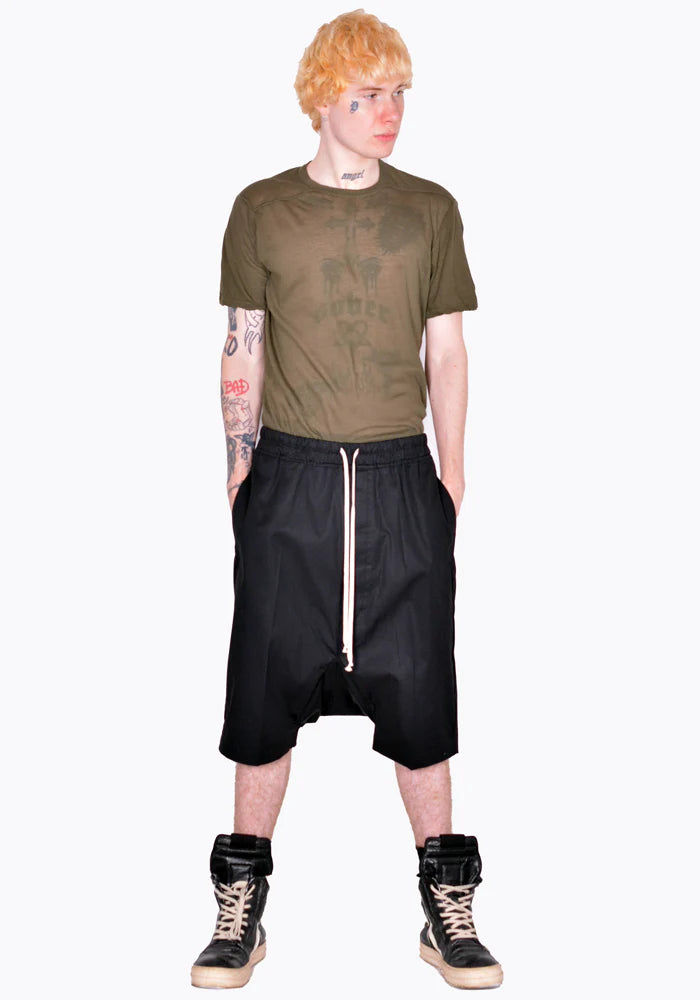 Men's Rick's pods shorts in black featuring an elastic waist band with a drawstring closure, concealed button front and drop crotch detail from Rick Owens 2026SS "STROBE" Collection.