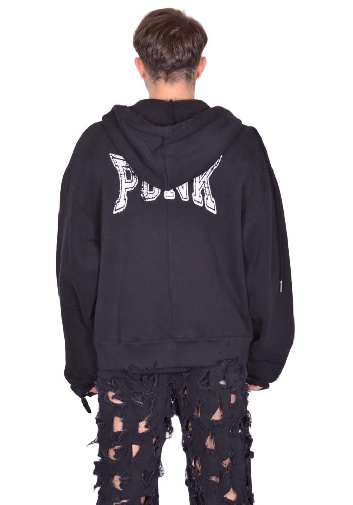 Unisex, distressed sweat hoodie in black organic cotton features a drawstring hood, zip front closure, long sleeves, "Punk" graphic print at back and distressed finish at cuffs and hem line from MATIERES FECALES collection.