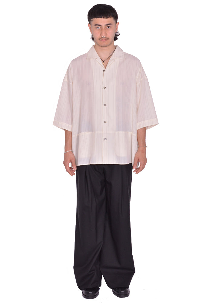 Unisex, Bowling shirt in ecru color rayon blend features a camp collar, button front closure, 1/2 sleeves and two side patch pockets from Individual Sentiments 2025SS Collection.