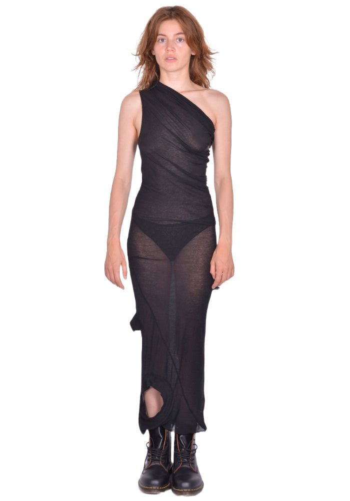 Layered T shirt in black organic cotton features a sleeveless, above hip length and two round holes with ribbed edges from Rick Owens 2025SS "Hollywood" Collection.