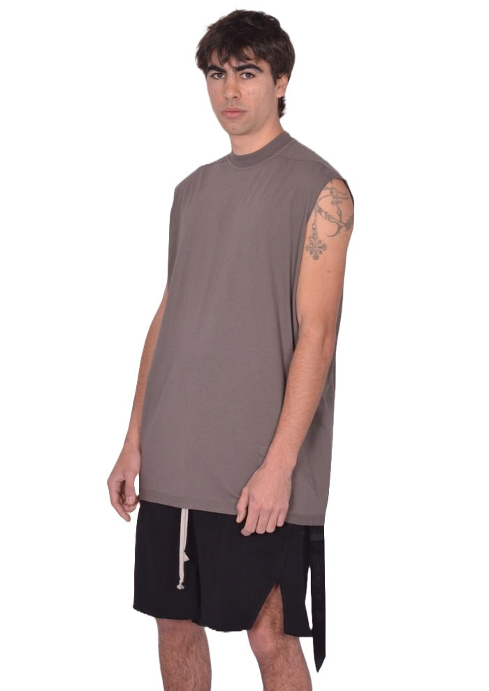 Men's sleeveless T-shirt in dust color cotton jersey featuring a crew neck, below hip length, wide shoulder with horizontal sholder seams and a central back seam from Rick Owens Drkshdw 2026SS Collection.