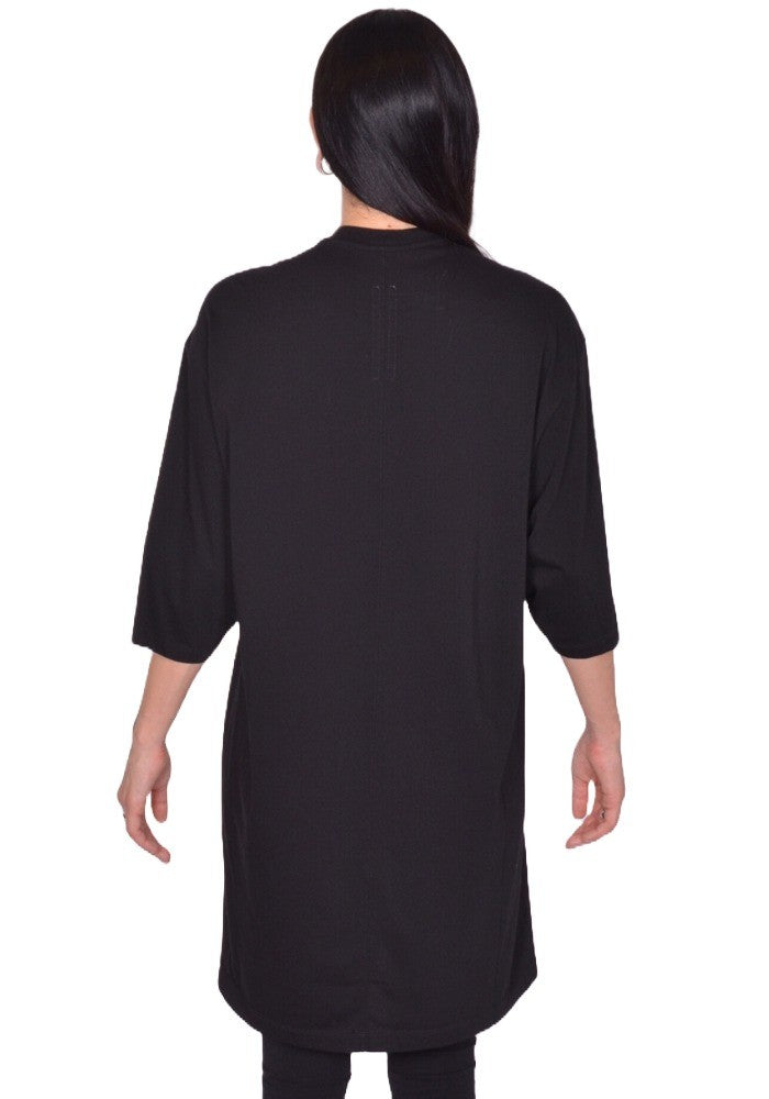 Women's oversize T-shirt in black organic cotton jersey featuring a crew neck, below hip length, elbow length sleeves, horizontal sholder seams and a central back seam from Rick Owens 2025FW "concordians" Collection.