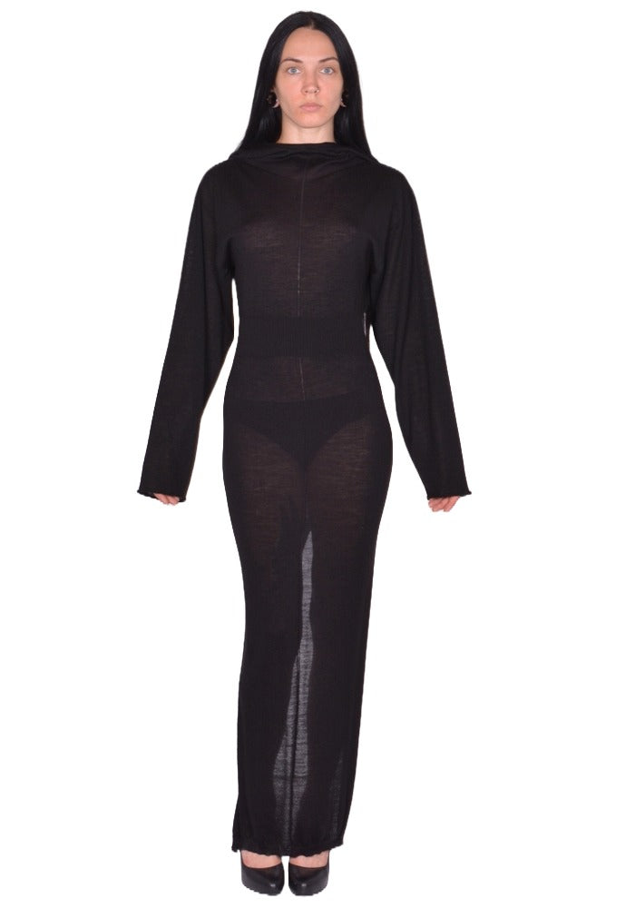 Maxi knit dress in black new wool features a large hood, drop shoulder, long sleeves with rolled edge cuffs and a deep back center slit from Rick Owens 2025FW "concordians" Collection.