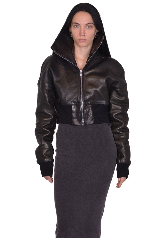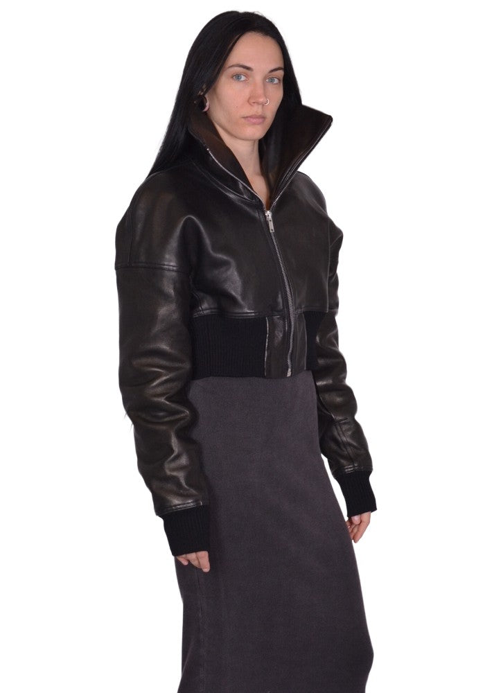 Cropped leather jacket in black features a fannel neck, zip front closure, dropped shoulder and long sleeves from Rick Owens 2025FW "concordians" Collection.