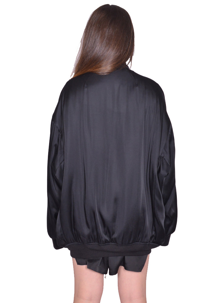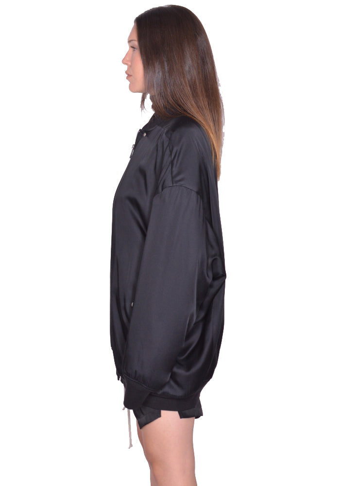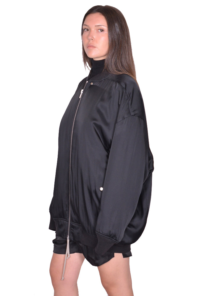 Oversized padded flight jacket in black acetate/viscose blend features a center front zip closure, dropped shoulders and dolman sleeves from Rick Owens 2025SS "Hollywood" Collection.