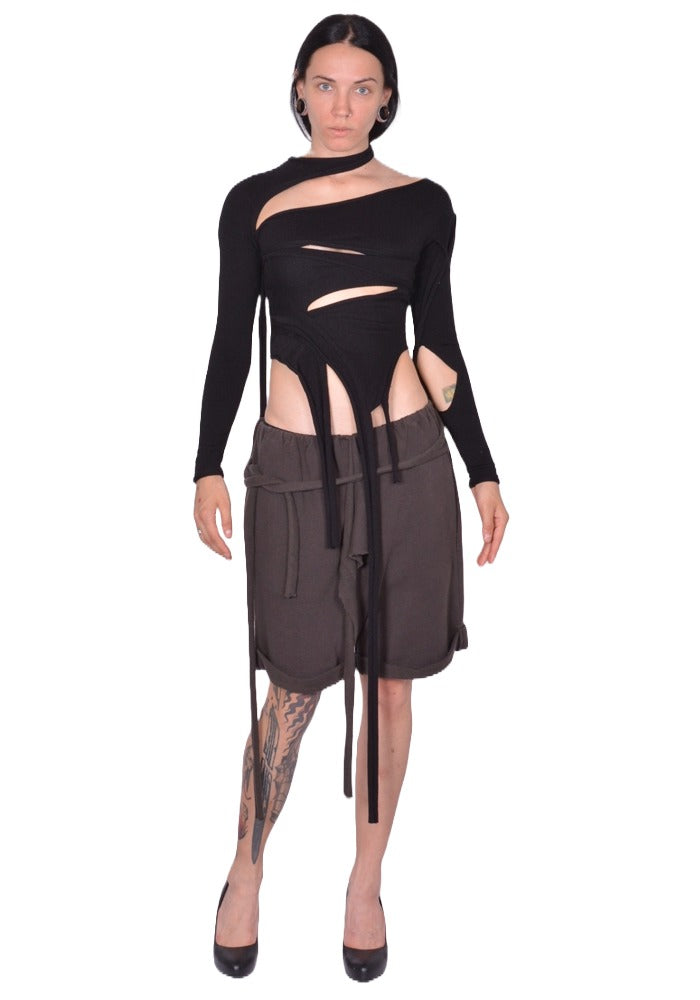 Asymmetric knit top in black viscose blend features a mock neck, long sleeves, cut-out details and multi straps from Ottolinger 2025FW collection.