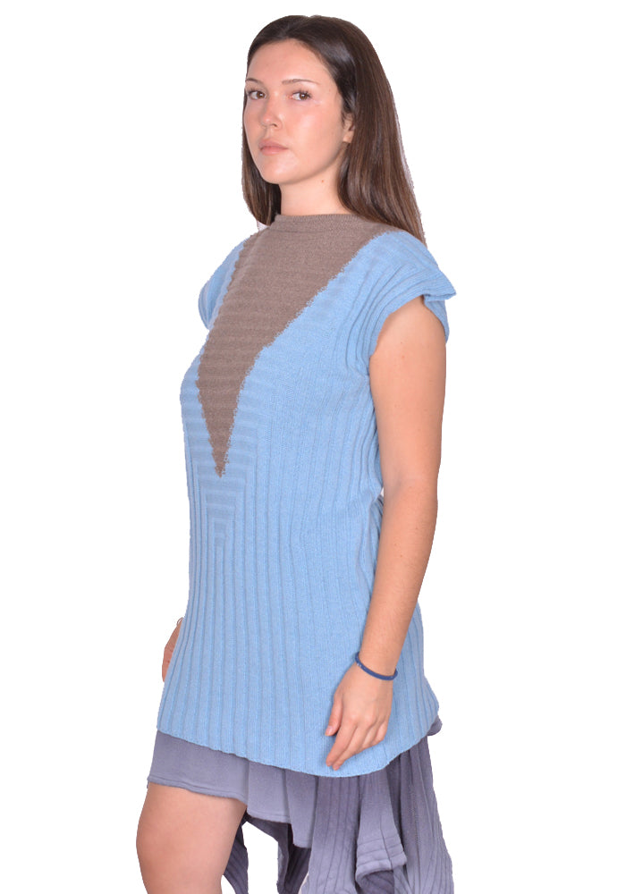 Rib knit long vest in cashmere blend features a boatneck, square shape, inverted triangle instarsia Intarsia panel at front and back from KIKO KOSTADINOV 2025SS Men's collection.