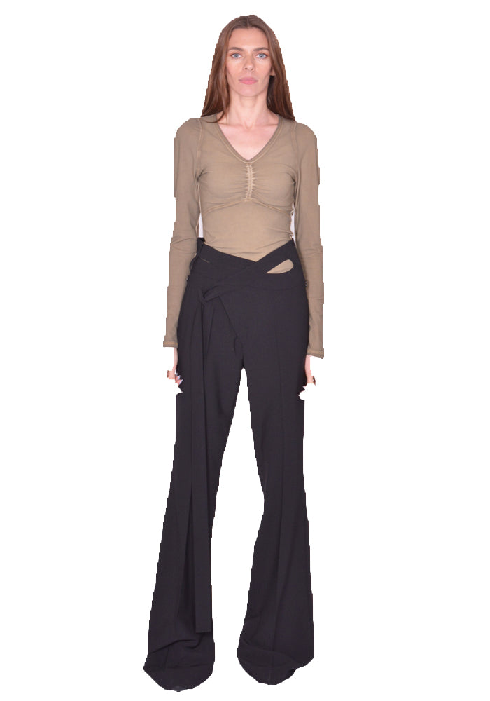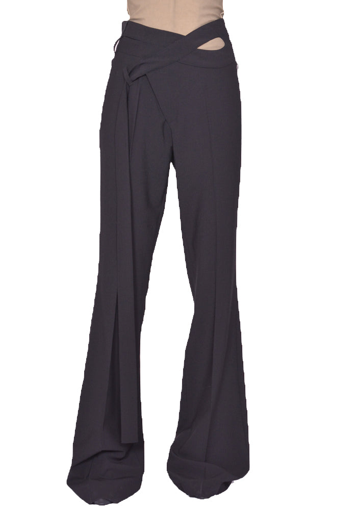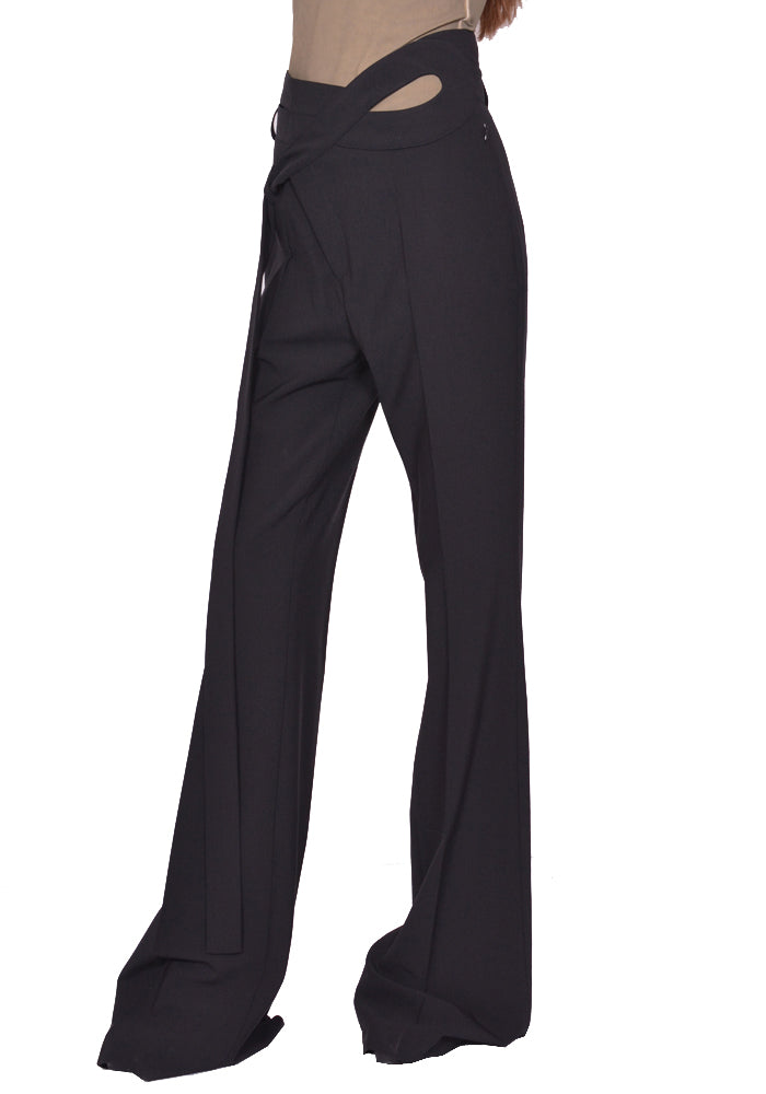 Flared wrap suit pants in black features a zip front with top hook closure, symmetrical wrapfront construction, self-tie straps, cutouts at waistband and flare legs from Ottolinger 2025SS collection.