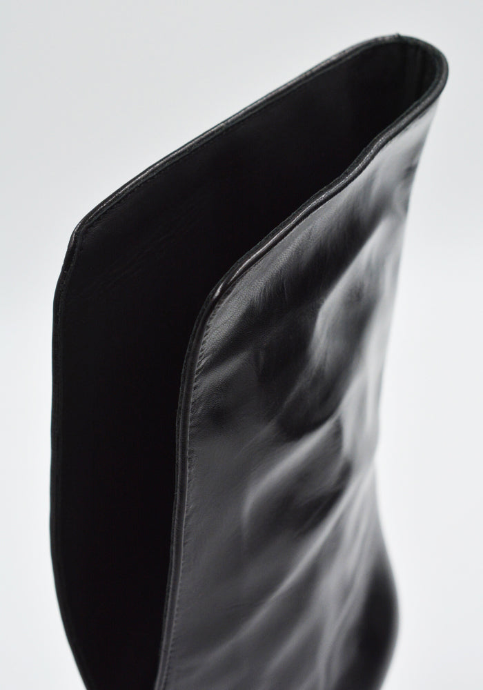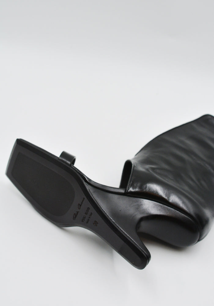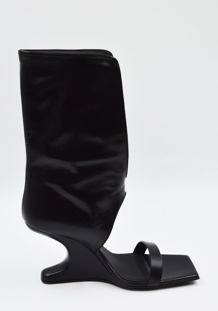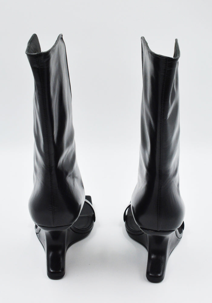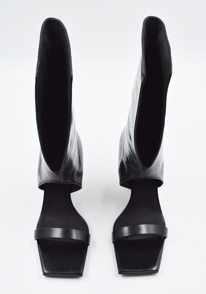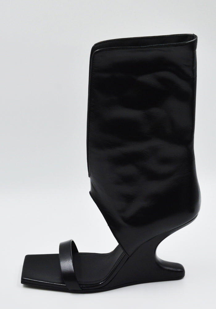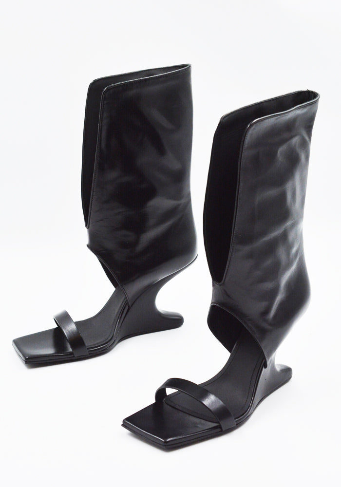 Women's bootie sandals in black features an open square toe, thin strap over the toe, center sprit calf panel and sculpture wedge heel from Rick Owens 2025SS "Hollywood" Collection.
