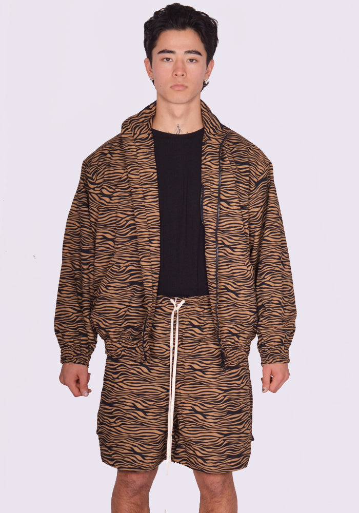 Unisex Zip jacket in tiger print all-over featuring a stand collar, full zip front closure, and elasticized cuffs and hem line from Yuiki Shimoji Collection.